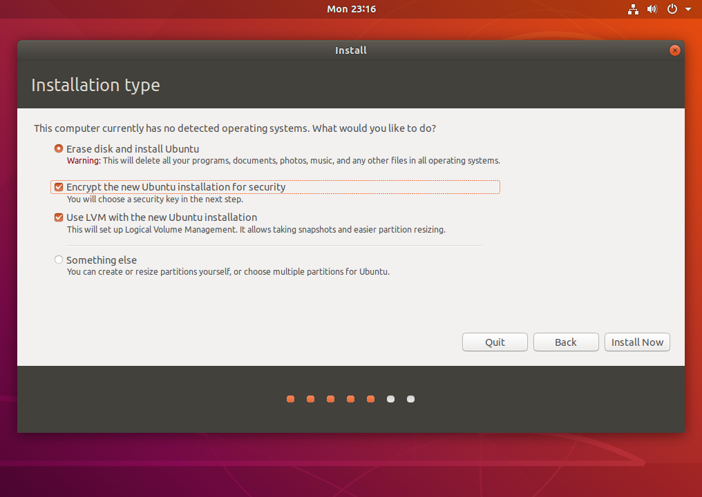 在这里选择第一项就是单系统,若要安装双系统建议先装win,之后装Ubuntu,千万不能选第一个,否则win就没了