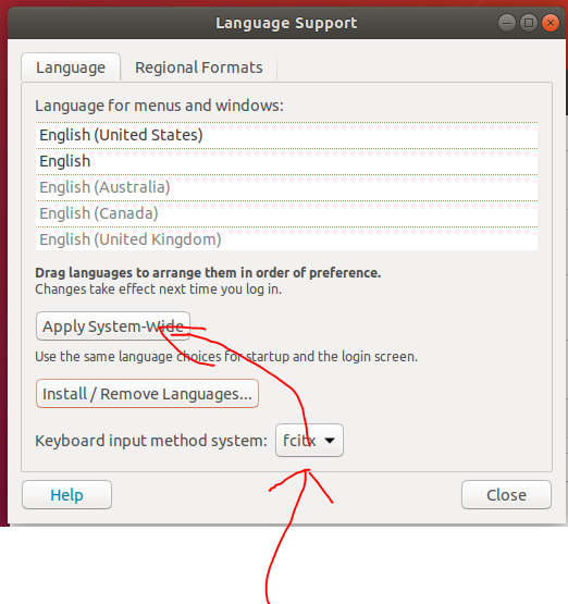 - 进入语言设置,根据红色箭头进入语言安装界面,安装语言(会自动安装中文语言),根据下方箭头更爱输入框架为fcitx,然后点击上面的Apply System-Wide应用到全局。然后将当前用户进行注销后再进行登录(注销没有效果,重启就可以了)。